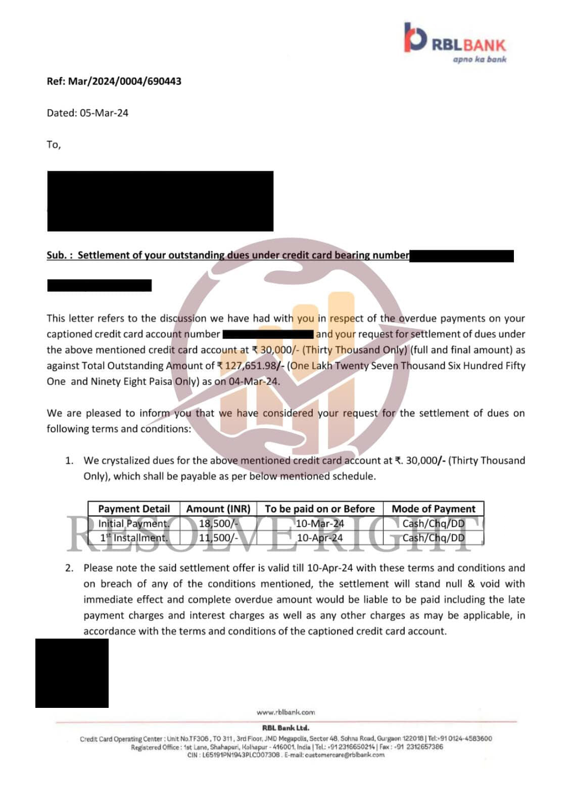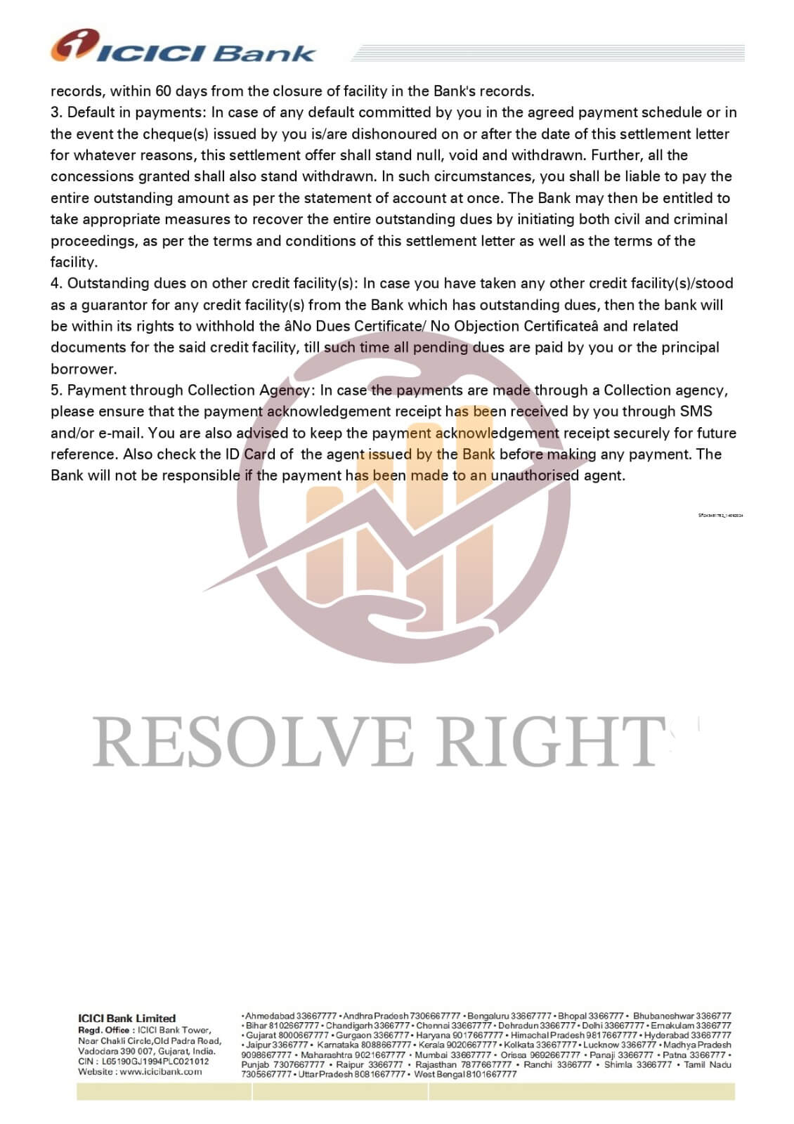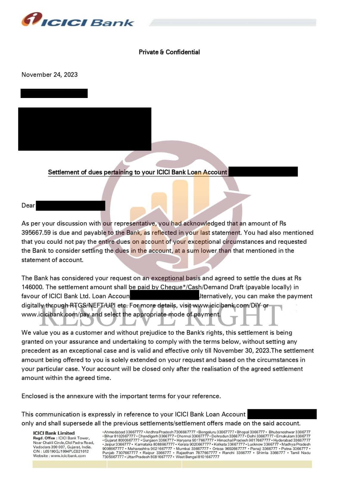 Resolve Right successfully negotiated my ICICI Bank settlement and guided me with timely updates. I’ve received my NOC and am confident about resolving the remaining issues.